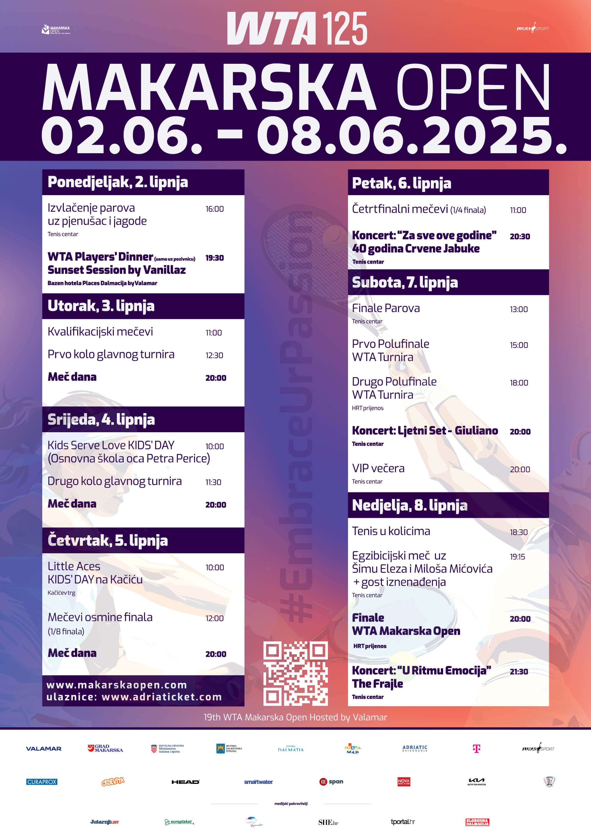 Uzbuđenje raste kako se bliži početak Makarska Open 2025, a sada napokon možete zaviriti u službeni program turnira! Otkrijte raspored mečeva, posebne događaje, zabavne večeri i sve što vas očekuje tijekom ovog sportskog spektakla na makarskoj rivijeri.